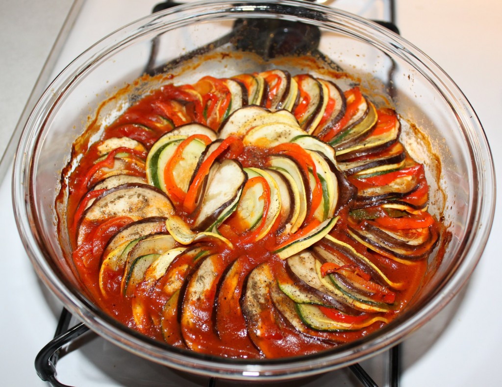 Atop the tomato sauce, arrange slices of prepared vegetables concentrically from the outer edge to the inside of the baking dish, overlapping so just a smidgen of each flat surface is visible, alternating vegetables. You may have a handful leftover that do not fit.