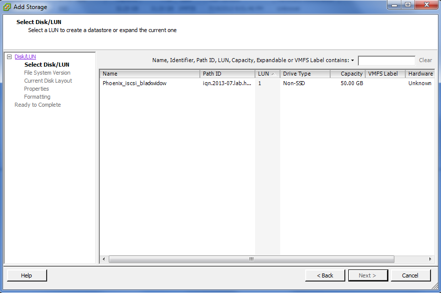 Here I just right-click the name, and change it to Phoenix_iscsi_blackwidow to follow convention. In ESXi, before you can use the target, you have to add it to the datastores. Goto Configuration ~> Storage, and then click Add Storage. Select Disk/LUN (as that is how iSCSI presents itself) and select the blackwidow disk we just added.