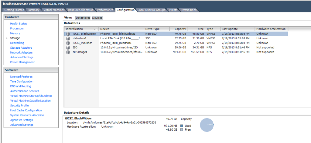 Since one of the aspirations I have for this site is learning via blogging/documentation (and get in a better habit of documenting steps in real IT projects, something I have NOT fared well with maintaining our own internal Wiki as well as I have liked), the first machine that I will create (outside of Punisher, which I needed for DNS to run the show). Since I run my virtual machines off of either NFS or iSCSI on Phoenix (my storage server), I will create a an iSCSI target for this machine (50GB) and attach it to my ESXi hypervisor (Deadpool). The reason I am attaching to Deadpool and not my KVM hypervisors is that they draw more power (Dell R510s vs a 1U homegrown machine with a 200W PSU) and the current heatwave does not have my wife in a good mood. So unfortunately for now it will be managed on a Windows machine (although down the road I will go into how to move images from ESXi and install them in KVM and vice-versa).