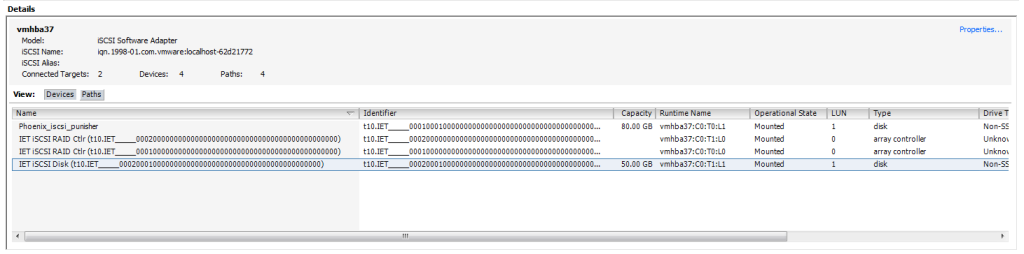 Before we can connect to an iSCSI disk in ESXi, we must first add the iSCSI target we just created to the datastores for VMWare. To do this, goto Configuration ~> Storage Adapters, and run the Rescan All command. This can take a while if you have a lot of targets, but usually comes back fast. The initial connection will be an unwieldy long ID, but you can tell which one it is by both its size (it’s 50GB, like we create) and also if you look at the Runtime Name, it’s the next higher target number (T1, as T0 is the first one for Punisher).