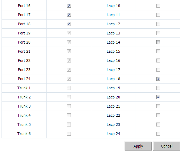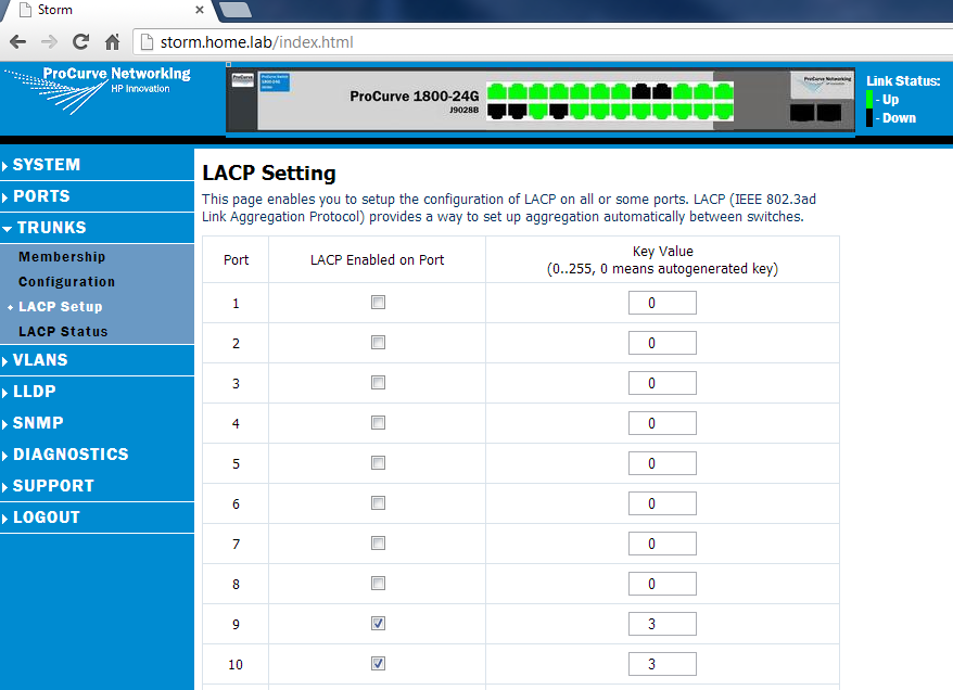 To create a LAG group, goto Trunks ~> LACP Setup and simply check the “LACP Enabled on Port” checkbox for the groups you would like to use, and make sure the key value matches for that set, as below: