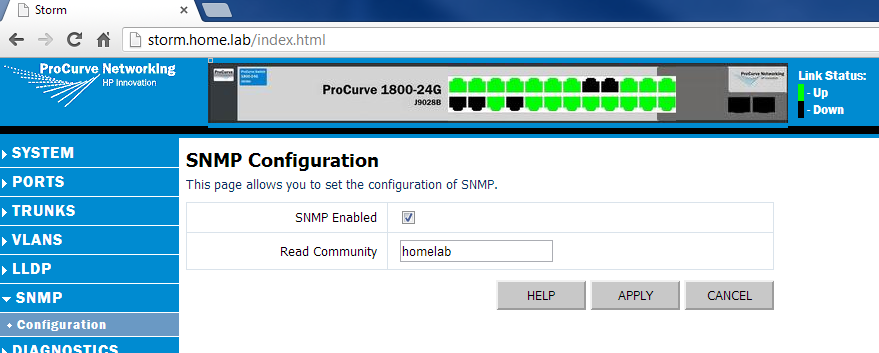The last step is just to enable SNMP. This usually requires just enabling SNMP, setting a read community name (careful with read-write, as that can permit an SNMP device to make changes to your switch), and permitting the IP of the SNMP trapper in some cases. With HP, this is simply done by clicking on the SNMP menu, clicking SNMP Enabled, and setting the Read Community name (in our case we’ll call it homelab) as below:
