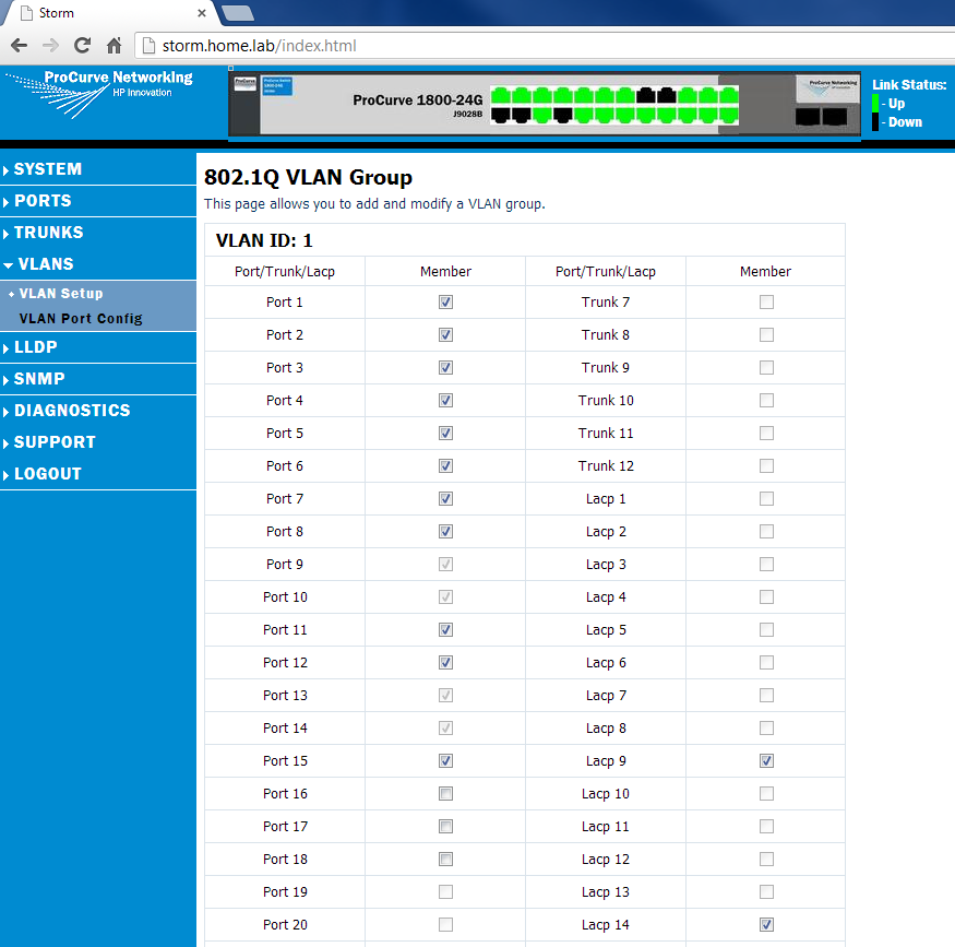 I like to segregate my switch visually, so you can see network segments in chunks. The first 15 ports will be VLAN1, the next 4 will be Lights Out, and the final ones will be storage. In the above example, I assigned the first 15 ports to VLAN1. You’ll notice that ports 9-10 and 13-14 are greyed out. That is because they are part of LACP group 9 and LACP group 14. When we assign those LAG groups to VLAN1, the ports will follow (they are greyed out as the switch does not see them as individual ports once you make them a LAG group – it treats the LAG group as one virtual port, with two members, in the above case).