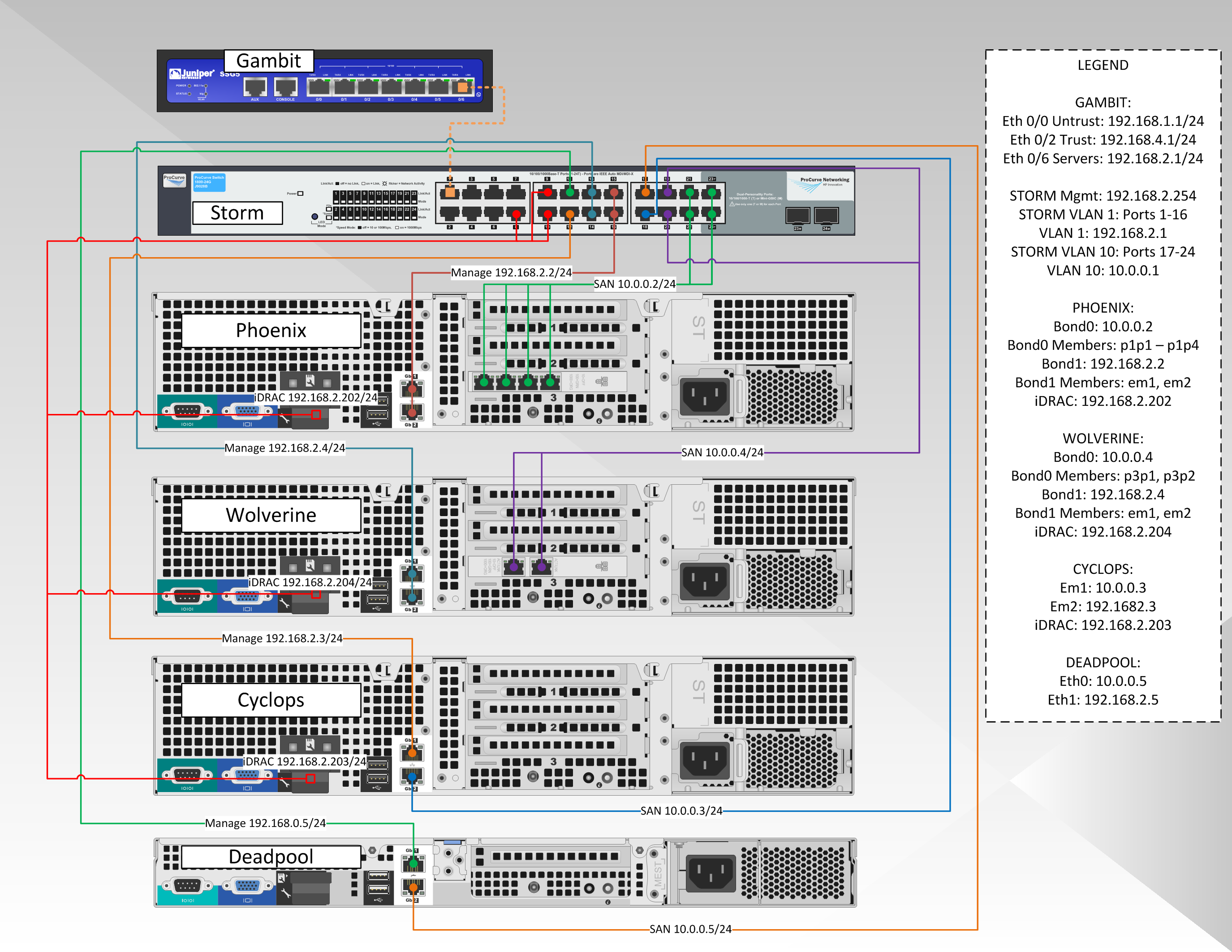 We’ll break down each server and the entire network step in their own pages. The HP switch believe it or not is pretty easy to setup. The SSG5 is a little tougher than it looks, especially if you want to get the proper security. And by tougher, I mean you have to fine tune the configuration, not that configuration is difficult. Some of the tweaks require trial and error, which of course burns some spare time.