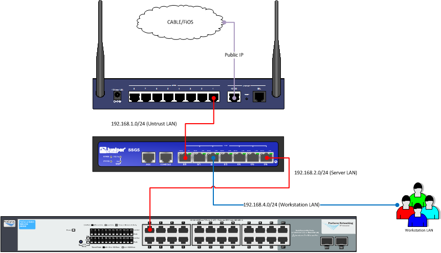 On the Juniper side, we have to create a DMZ subnet (which comes standard with the device), as well as a Trust VLAN for the workstations, so they are isolated from both the DMZ and the outside world. The Trust VLAN will have access to the DMZ and Untrust locations, but not the other way around. This is done with policies with Juniper, which I will go into further detail on it’s own page.
