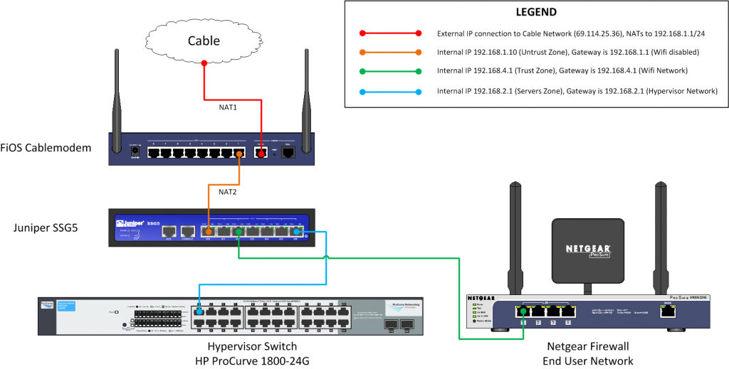 The hypervisor network has its own zone created, called “Servers” in the Juniper. You can use the default DMZ subnet that comes with the Juniper, but I like rolling my own. I’ll go into how I configured the SSG5 on its own page, just going over the logical diagram of what we are doing here.